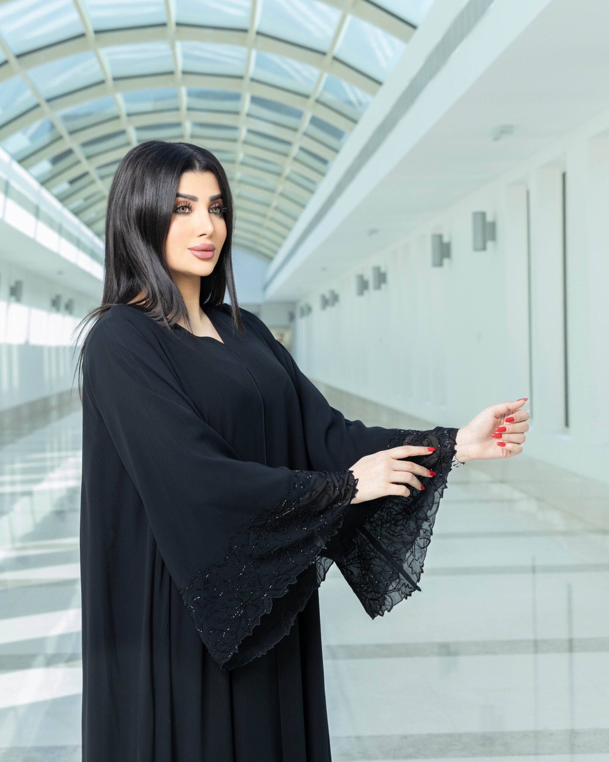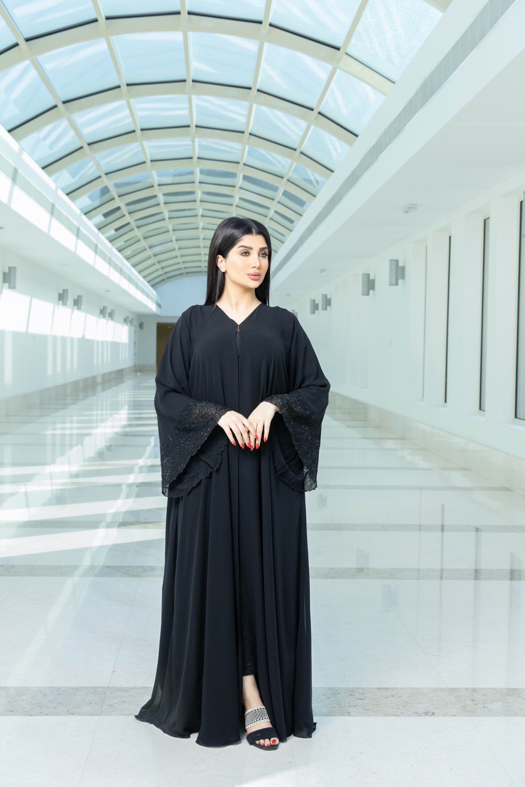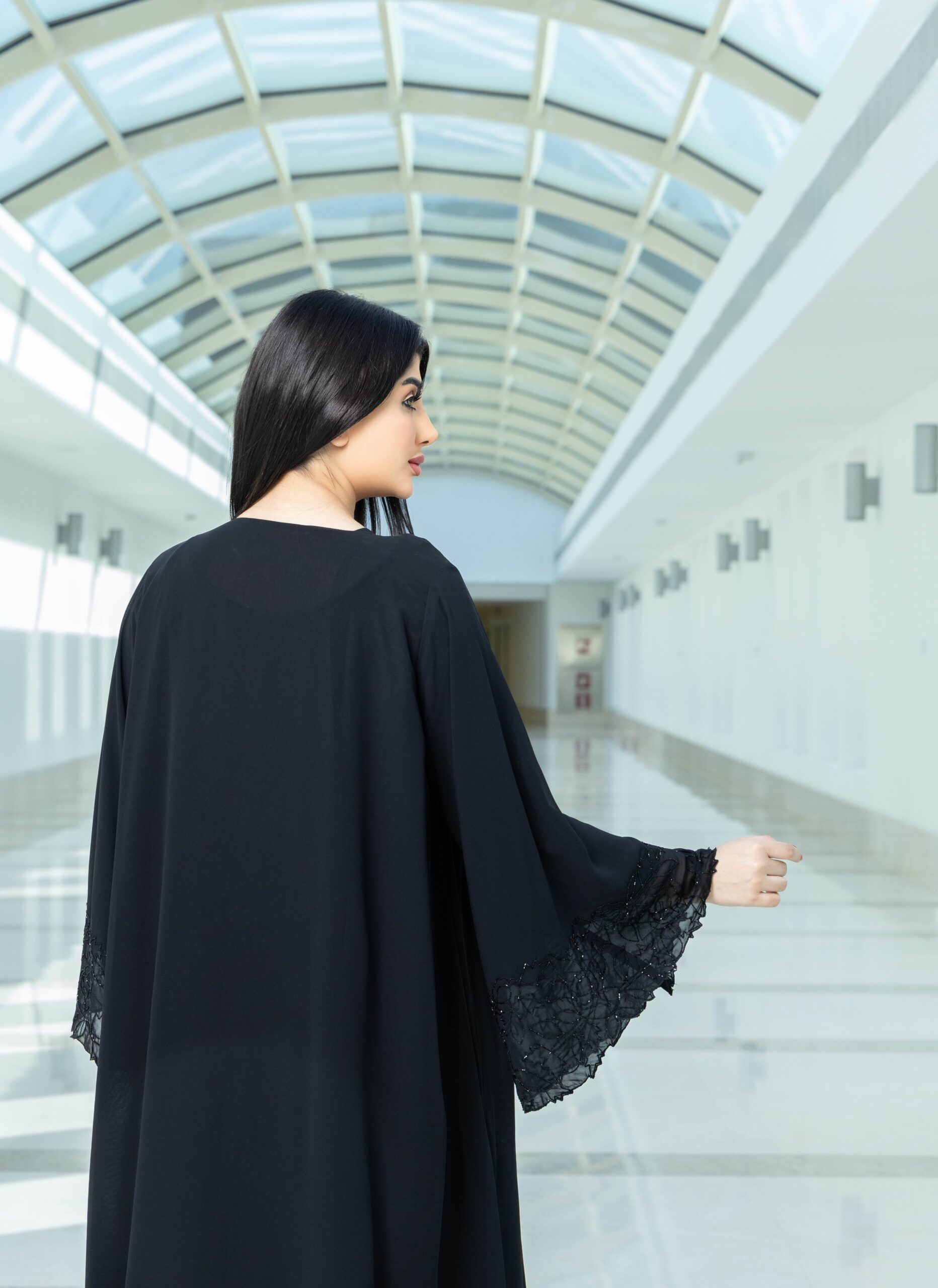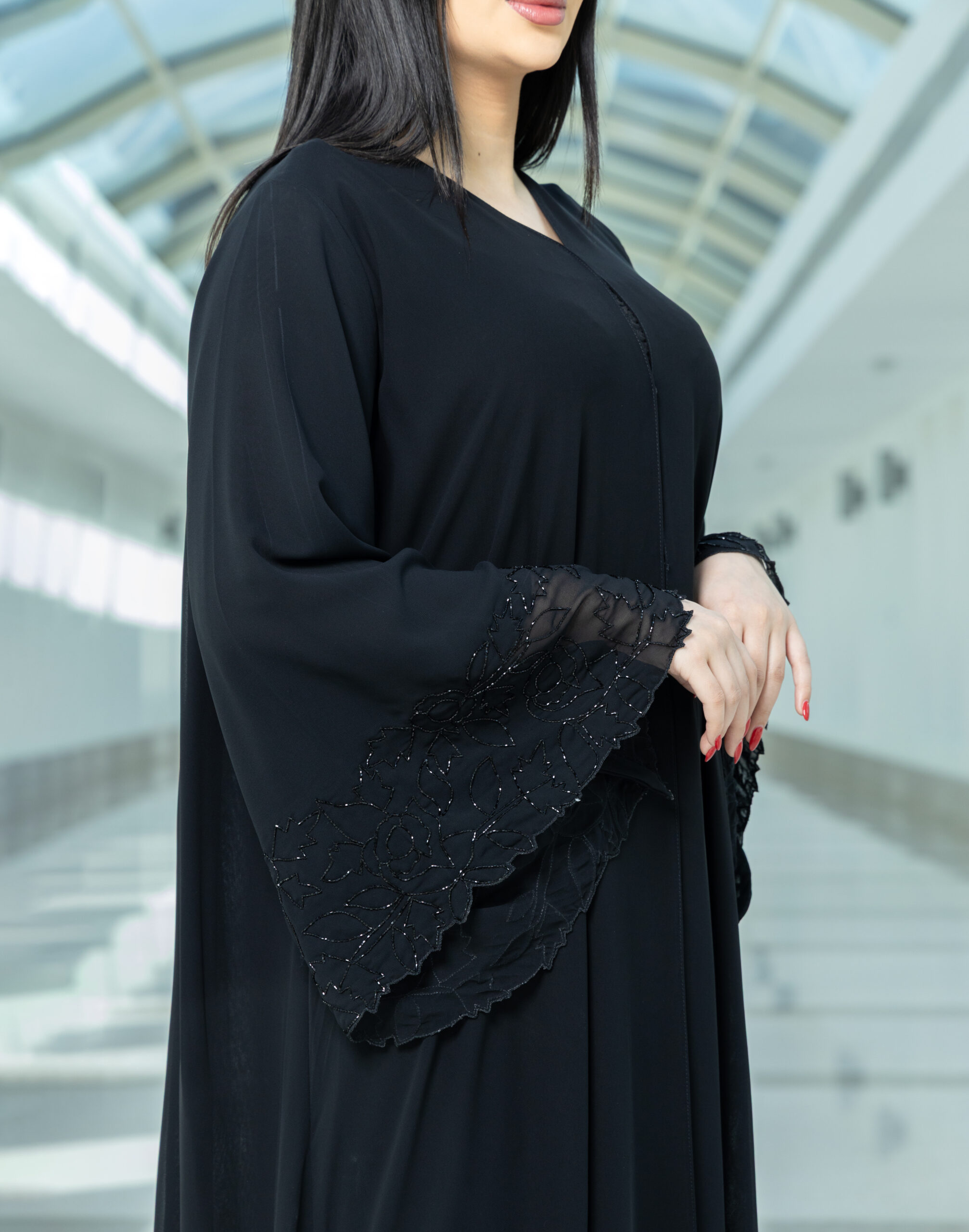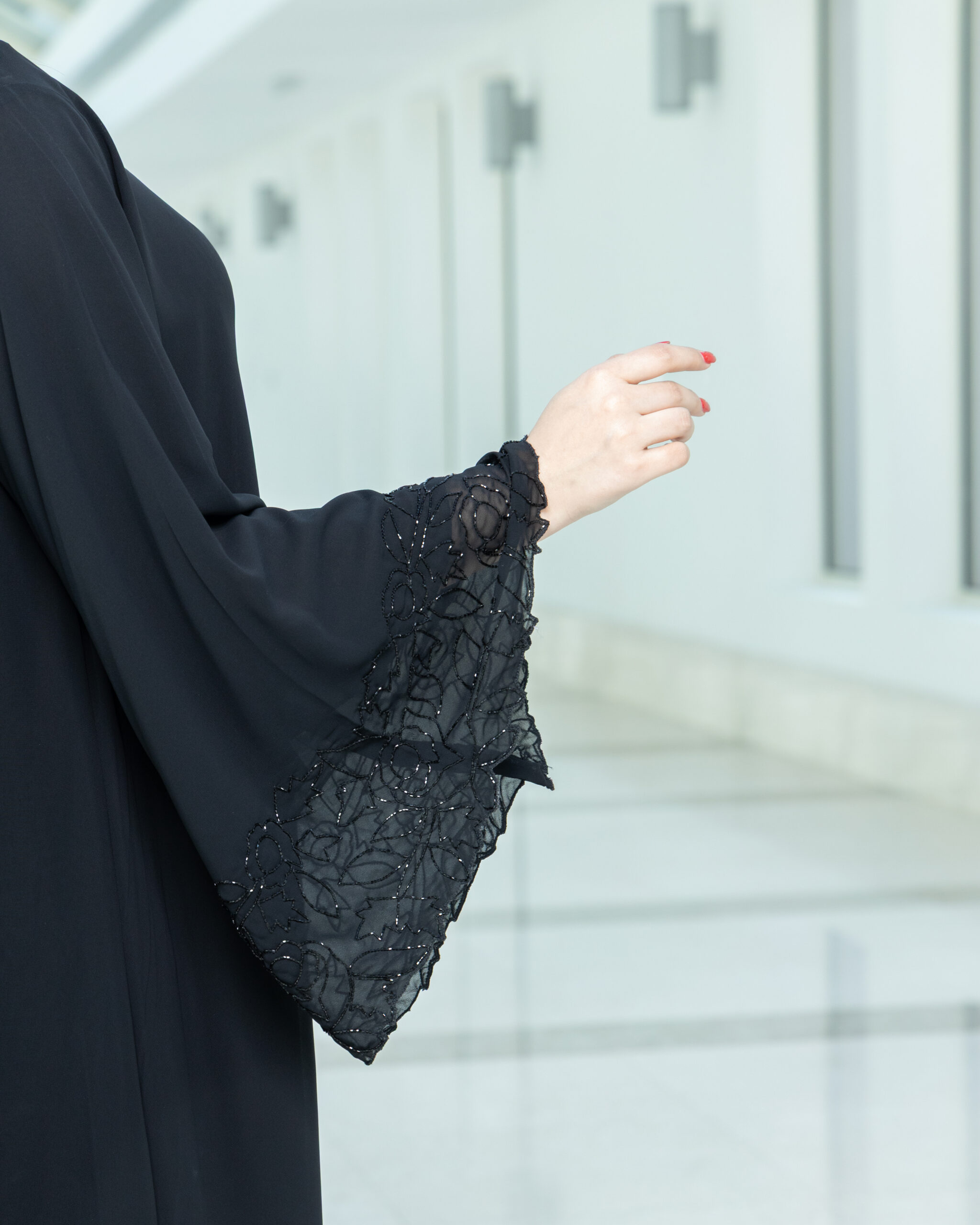 An elegant black abaya featuring delicately embroidered sleeves adorned with subtle black beads for a refined, feminine touch.